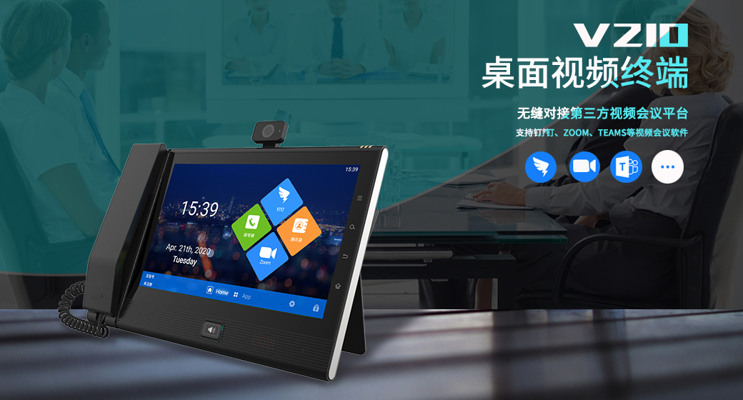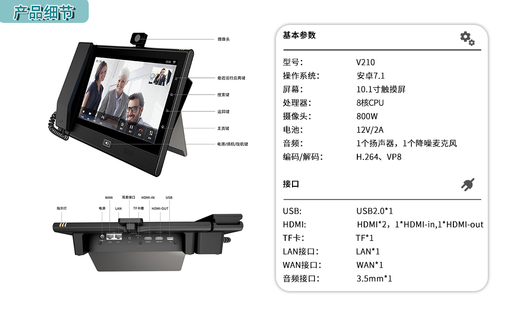 天波視頻會議一體機(jī)V210是一款融合音視頻通話、高清視頻會議、視頻直播的高端桌面會議終端。外觀簡潔大方,搭載Android 7.1.2系統(tǒng),配置10.1英寸1280*800多點(diǎn)觸控IPS電容屏和800萬像素可翻轉(zhuǎn)210度的廣角高清攝像頭,支持高清視頻會議主流與輔流同時傳輸,是小型會場、辦公桌面的最佳選擇。