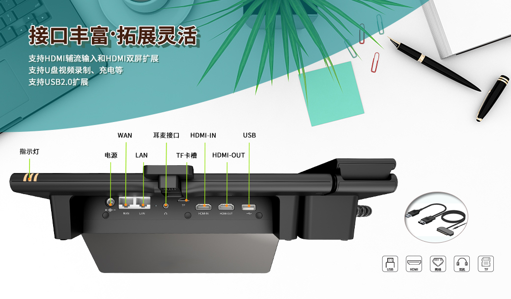 視頻會議一體機(jī)有2個網(wǎng)口、2個HDMI、一個USB、一個耳機(jī)接口、一個TF接口,滿足視頻會議的場景,支持HDMI輔流輸入和HDMI雙屏擴(kuò)展,支持HDMI輔流輸入和HDMI雙屏擴(kuò)展,支持USB2.0擴(kuò)展,支持U盤視頻錄制、充電等